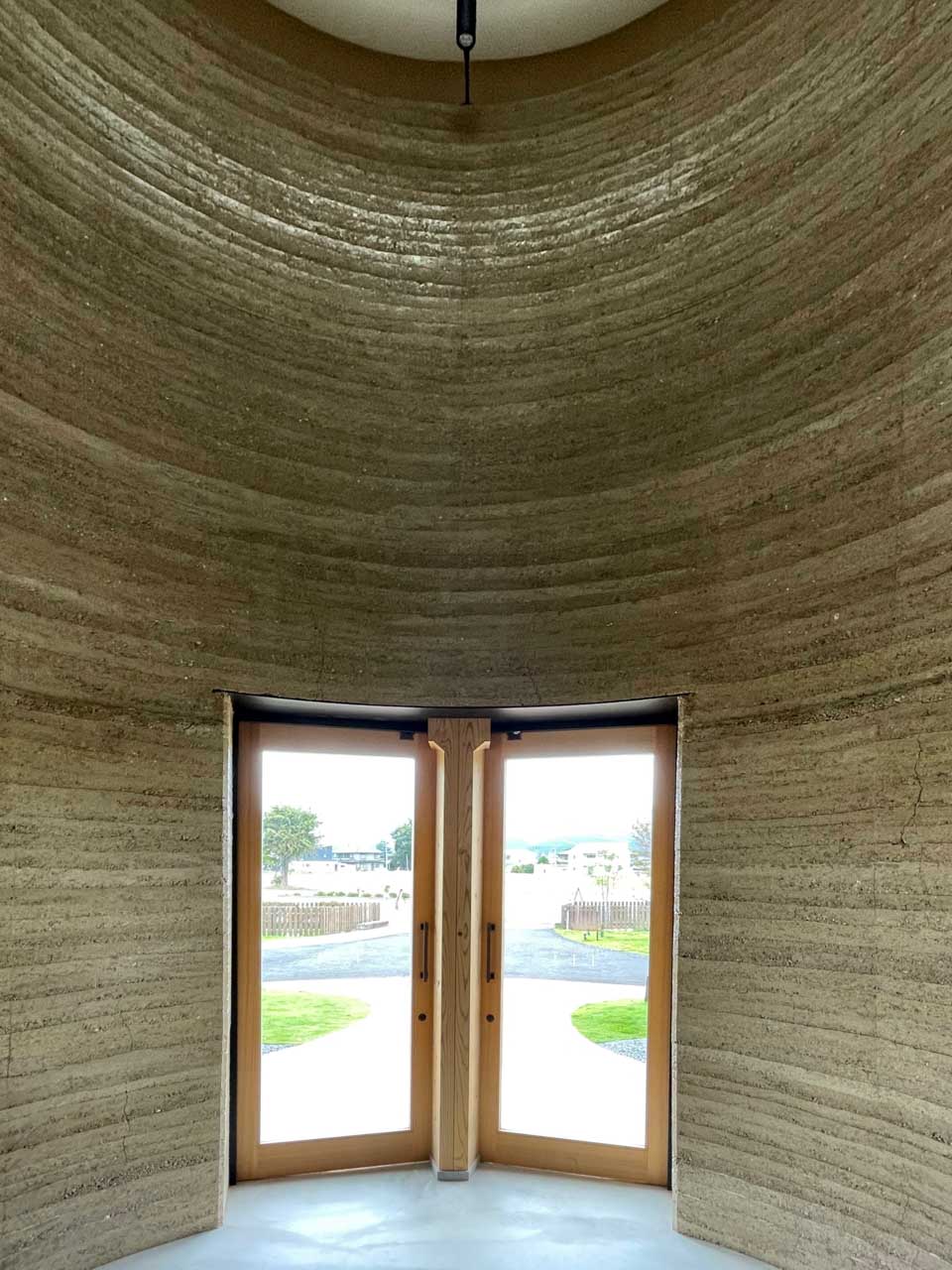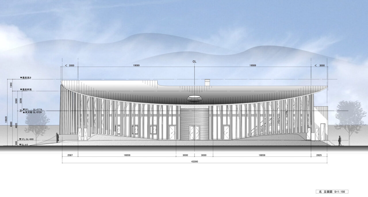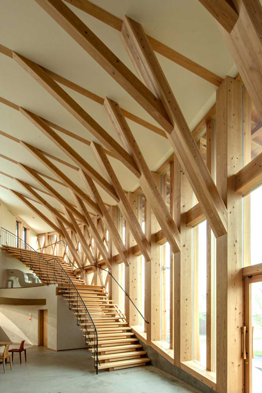 La simbolica sala circolare chiusa con vetro avrà spessi pilastri di legno distanziati di 1,5 metri, e una parete divisoria in legno con pilastri a tamburo alti 7 metri distanziati della metà dei pilastri stessi. Le travi a ventaglio sono un importante elemento di design in ogni angolo dell’edificio.