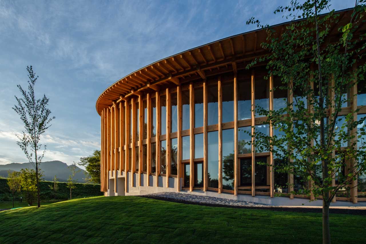L’edificio ha due funzioni principali: uno spazio circolare nella parte anteriore per il negozio e altri spazi, e uno spazio rettangolare nella parte posteriore per la fabbrica. Il design dell’edificio si basa sull’idea che l’intero edificio dovrebbe fondersi con la catena montuosa circostante, con un grande tetto dolcemente curvo che avvolge l’intero edificio. Sebbene il tetto in sé abbia una forma semplice, le avanzate tecniche di cesellatura a mano dei carpentieri sono state utilizzate per creare una struttura in legno di circa 40 metri di lunghezza e larghezza, le cui dimensioni variano di millimetri a causa delle curve sia in pianta che in sezione. Anche la copertura con lastre di acciaio galvalume è fatta a mano, con ogni pezzo piegato e applicato senza soluzione di continuità sul posto.