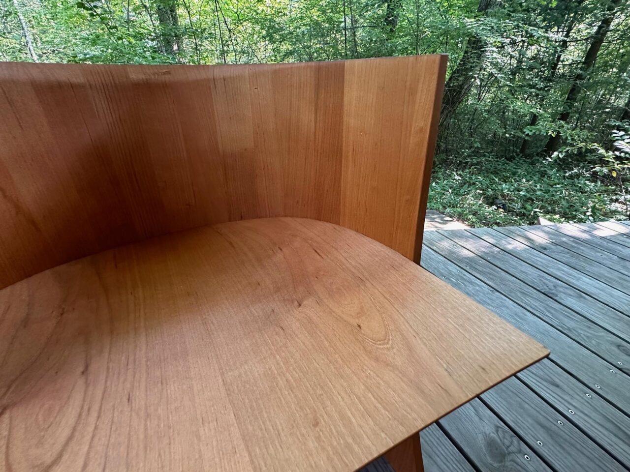 日本の美意識「反り」のある座面が曲面の背板に差込まれて浮かび、 緊張感のあるバランスの中に日本の伝統技術と美意識、そして 森が組込まれている。