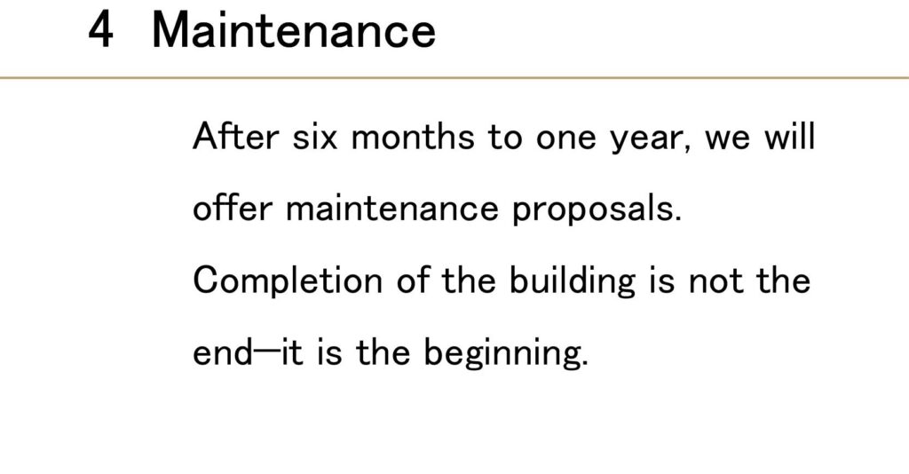 Our design process is not about simply fulfilling requests as they are. We listen carefully to your needs and, based on our experience and design expertise, provide proposals that go beyond your expectations while considering your budget and timeline.